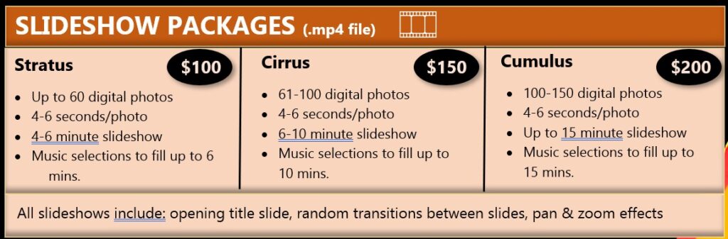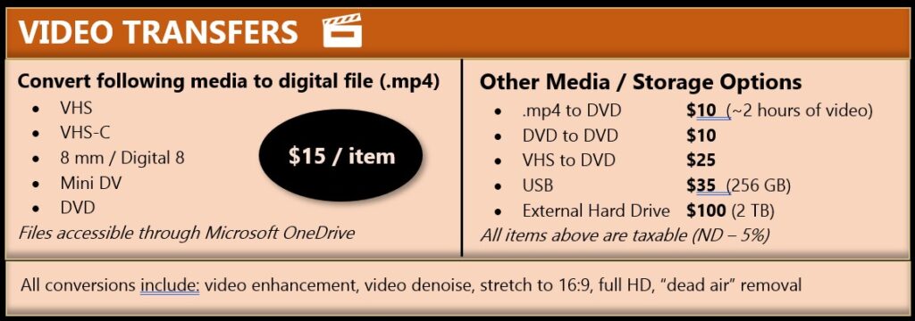 Services Offered video transfers slideshow packages drone video & Photo Photography Safeguard your precious memories! With over 20 years of experience in physical and digital media, we handle your memories with care so you can enjoy them for decades to come.